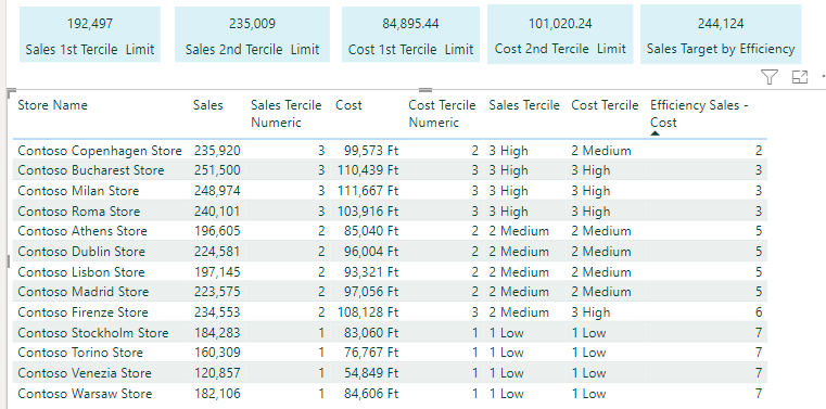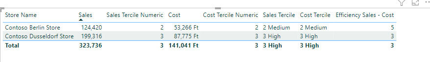 Please create or imagine the same measures with cost (TotalCost). The following measure creates an efficiency matrix out of the two terciles. The case when either or both measures are blank is dependent on the business context, in the context of the Contoso database there is no sales without cost but you could have cases where one can exist without the other. Unlike the sales the cost is lower the better, therefore the best case is if a store belongs to the biggest sales tercile and the lowest cost tercile.