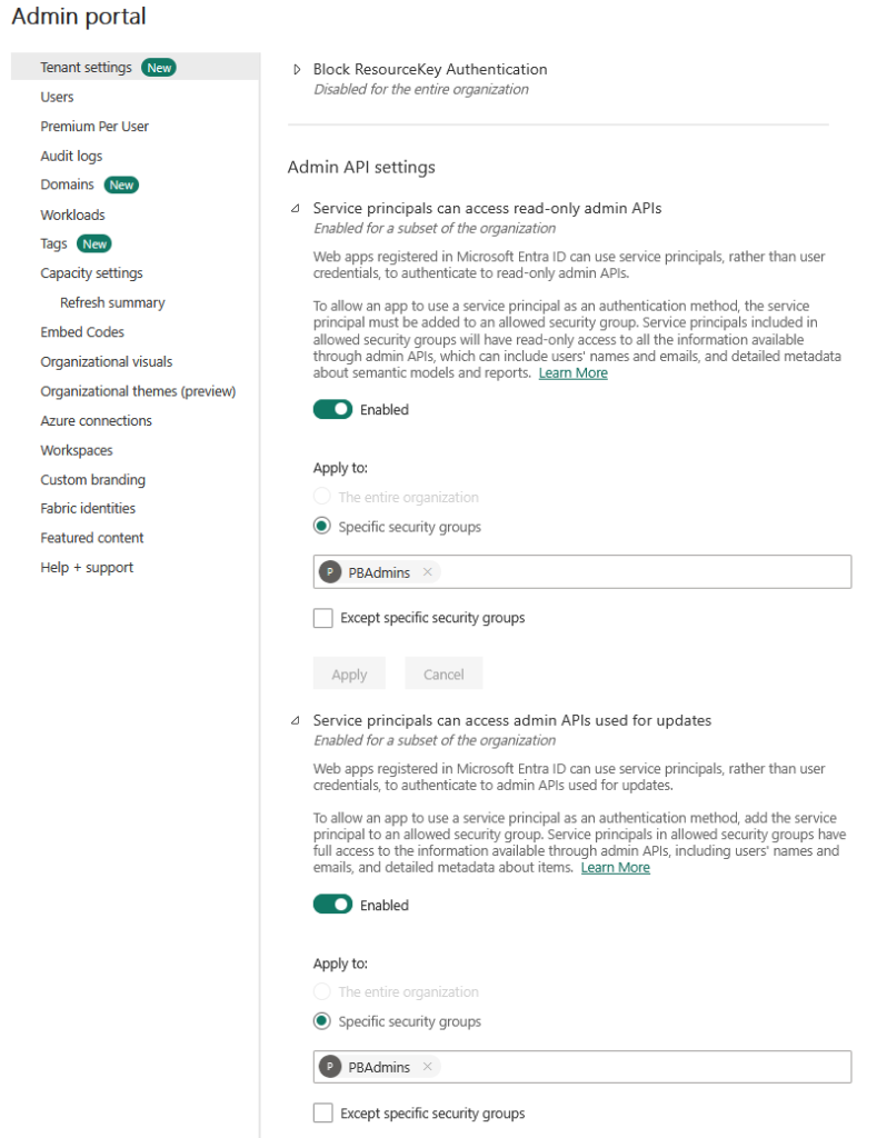Create an MS Entra (Active Directory) group for the Service Principal, I named it PBAdmins in my example. Enable using the Admin API for read only and or updates (read-write) in the Fabric Admin portal.
